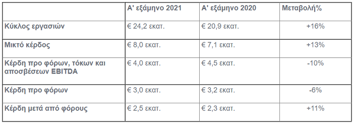- Ο κύκλος εργασιών ανήλθε σε €24,2 εκατ., έναντι €20,9 εκατ. την αντίστοιχη περίοδο του 2020.