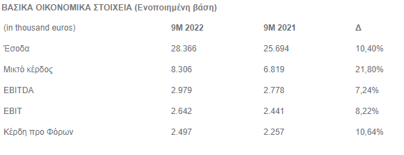-Το EBITDA ανήλθε στα 2,98 εκατ. ευρώ, σημειώνοντας αύξηση 7,24% σε σύγκριση με το εννεάμηνου του 2021.
