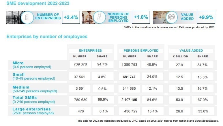 Σύμφωνα πάντως με την έκθεση της Κομισιόν το 2023, οι ΜΜΕ στην Ελλάδα συνέχισαν την ανάκαμψή τους, με την προστιθέμενη αξία τους να ενισχύεται κατά 9,9% και την απασχόληση να σημειώνει αύξηση κατά 1% Ωστόσο, καθώς η αύξηση της προστιθέμενης αξίας δεν προσαρμόζεται πληθωριστικά οι πληθωριστικές πιέσεις οδηγούν το πραγματικό μέγεθος της ανάπτυξης στο 3,0%.