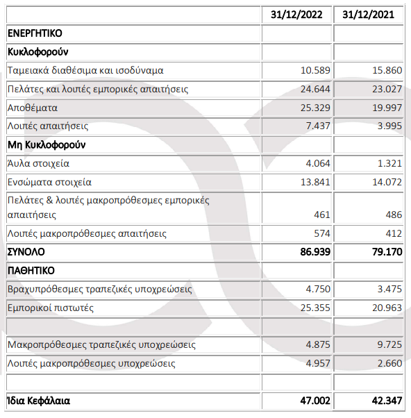 Τα ίδια κεφάλαια αυξήθηκαν στα €47,0εκ από €42,3εκ το 2021.Ο δείκτης φερεγγυότητας του Ομίλου (καθαρή θέση ως % του συνόλου του ενεργητικού χωρίς τα μετρητά και ισοδύναμα) στις 31.12.2022 ήταν 61,6%.