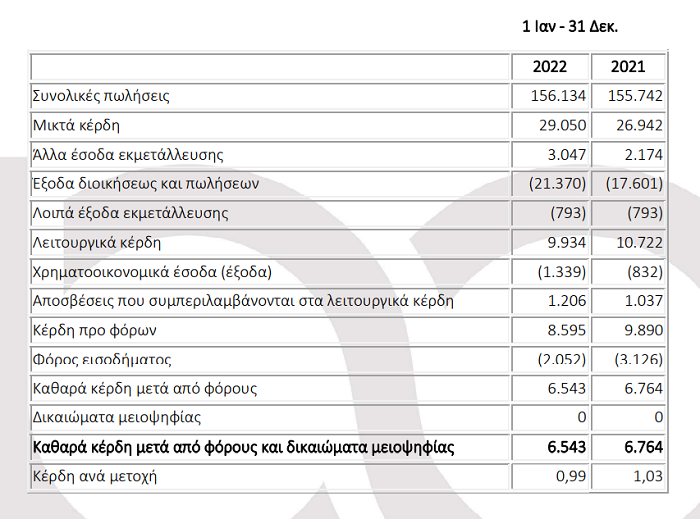 Όπως αναφέρει η εταιρεία, οι πωλήσεις του Ομίλου ανήλθαν σε €156,1εκ, οριακά αυξημένες από το 2021. Η εξαιρετική επίδοση των πωλήσεων των Μονάδων Λιπαντικών και Φορτηγών Λεωφορείων αντισταθμίστηκε από τις μειωμένες πωλήσεις του αγροτικού τομέα λόγω της καθυστέρησης των νέων εθνικών σχεδίων βελτίωσης και τις πιέσεις στις πωλήσεις των επιβατικών αυτοκινήτων λόγω των καθυστερήσεων στην εφοδιαστική αλυσίδα οχημάτων και ανταλλακτικών.