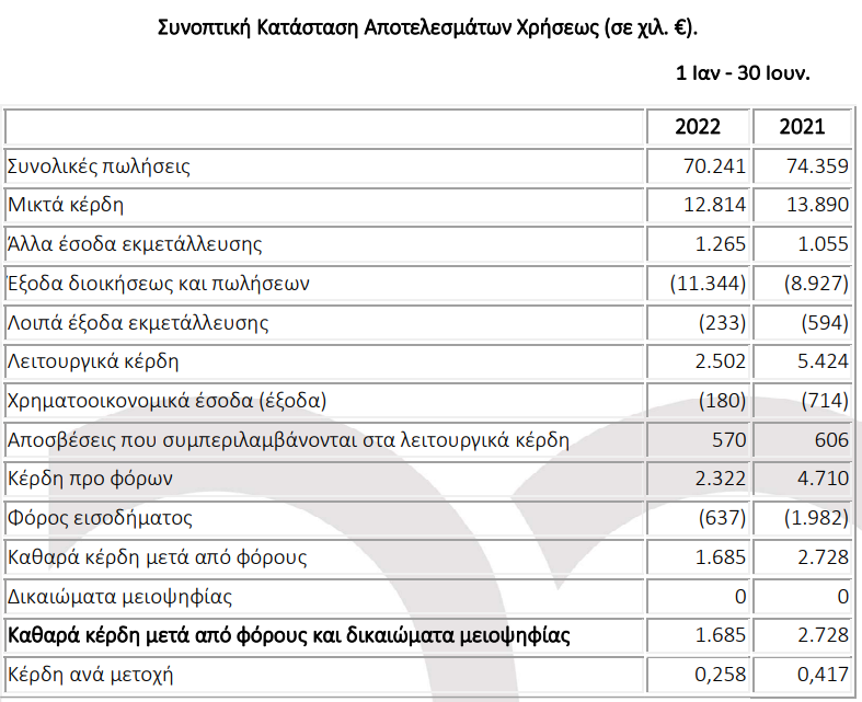 Οι πωλήσεις του Ομίλου κατά την περίοδο 1η Ιανουαρίου – 30 Ιουνίου μειώθηκαν κατά 5,5% και ανήλθαν σε €70,24εκ από €74,36εκ στις 30.6.2021, που είχαν σημειώσει πολύ μεγάλη αύξηση σε σχέση με το α΄ εξάμηνο της προηγούμενης χρονιάς.