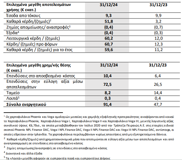 Για το οικονομικό έτος 2024, η Εταιρεία έχει λάβει έσοδα από κουπόνια αξίας €10,6 εκατ. σε σχέση με τις Ομολογίες που κατέχει. Περαιτέρω, έπειτα από τις 31 Δεκεμβρίου 2024, η Εταιρεία εισέπραξε €3,4 εκατ. κουπόνια. Η πληρωμή κουπονιών στους κατόχους των ομολογιών μεσαίας εξοφλητικής προτεραιότητας που εκδόθηκαν από το Vega III NPL Finance DAC αναβλήθηκε το 2024, ενώ από το 2ο τρίμηνο 2024, η πληρωμή κουπονιών στους κατόχους των ομολογιών μεσαίας εξοφλητικής προτεραιότητας που εκδόθηκαν από το Phoenix NPL Finance DAC έχει επίσης αναβληθεί.