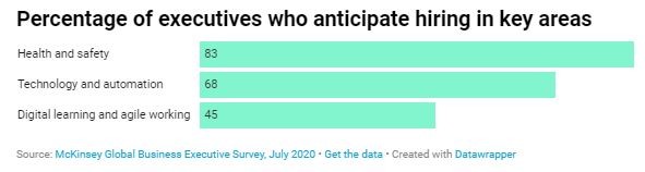 Σε νέα της έκθεση για το εργατικό δυναμικό στη μετά-κορωνοϊό εποχή, η παγκόσμια εταιρεία συμβούλων McKinsey & Company διεξήγαγε έρευνα με τη συμμετοχή 800 κορυφαίων επιχειρηματικών στελεχών από όλο τον κόσμο, σχετικά με το σε ποιους τομείς σχεδιάζουν να αυξήσουν τις προσλήψεις μετά την πανδημία.