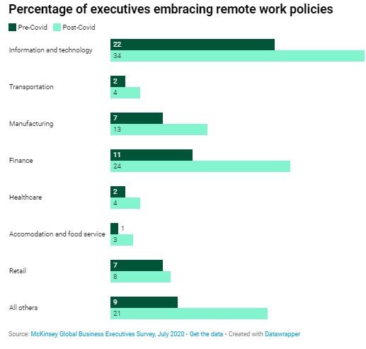 Εξάλλου, όπως αναφέρει η έρευνα της McKinsey, για τις ΗΠΑ πένω από το 60% των εργαζομένων δεν μόρεί να εργαστεί εξ αποστάσεως. Όπως αναφέρει επίσης «σε λιγότερο ανεπτυγμένες οικονομίες, το ποσοστό των εργαζομένων που δεν μπορεί να δουλέψει με τηλεργασία, αυξάνεται ακόμα περισσότερο».