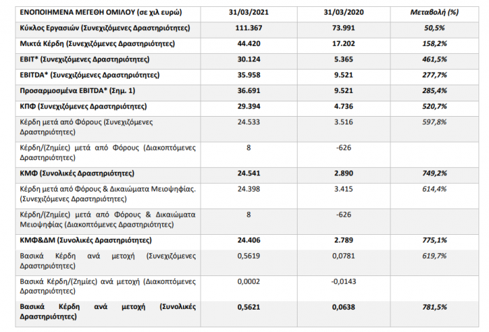 Ειδικότερα, στον πίνακα στη συνέχεια παρουσιάζονται τα βασικά οικονομικά μεγέθη του Ομίλου για το α’ τρίμηνο της τρέχουσας χρήσης σε σχέση με την αντίστοιχη περίοδο της χρήσης 2020. Επισημαίνεται ότι οι διακοπτόμενες δραστηριότητες αφορούν στη διακοπή της παραγωγικής λειτουργίας της θυγατρικής στην Αμερική, Thrace Linq Inc.