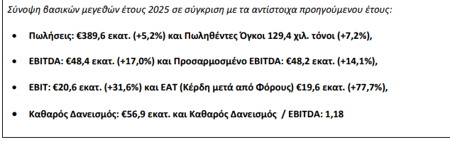Η λειτουργική κερδοφορία EBITDA ανήλθε σε €48,4 εκατ., αυξημένη κατά 17%, σε σύγκριση με το 2024, όπου είχε διαμορφωθεί σε €41,4 εκατ. Σε επίπεδο προσαρμοσμένου EBITDA, η αύξηση ανήλθε σε 14,1%, συγκριτικά με το 2024. Τα Κέρδη προ Φόρων (ΚΠΦ) για το 2025 ανήλθαν σε 19,9 εκατ., αυξημένα κατά 45,1%, συγκριτικά με το προηγούμενο έτος. Η εξέλιξη αυτή καταδεικνύει τη σημαντική βελτίωση της λειτουργικής κερδοφορίας του Ομίλου, παρά τις αντίξοες οικονομικές συνθήκες, τη συνεχιζόμενη χαμηλή ζήτηση και την αύξηση της κοστολογικής βάσης.