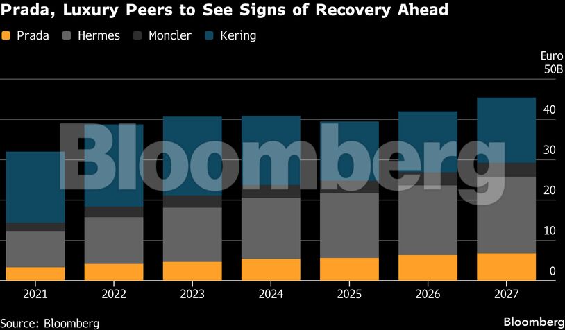 Για το 2025, τα έσοδα της Prada εκτιμάται ότι θα αυξηθούν κατά 4,6%, επίδοση που θα είναι η πιο αργή από το 2020, αποτυπώνοντας την κόπωση της ζήτησης σε βασικές αγορές.