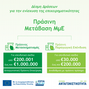 Προκηρύχθηκε η δέσμη δράσεων «Πράσινη Μετάβαση ΜμΕ», προϋπολογισμού 700 εκατ. ευρώ , που εντάσσεται στο νέο Πρόγραμμα «Ανταγωνιστικότητα» του ΕΣΠΑ 2021 – 2027, με απόφαση του υφυπουργού Ανάπτυξης & Επενδύσεων, Γιάννη Τσακίρη.
