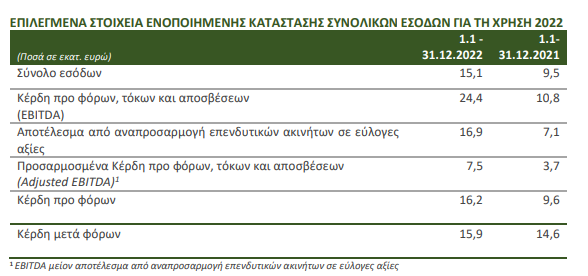 – Αύξηση εσόδων κατά 58% και διπλασιασμός λειτουργικής κερδοφορίας (Adjusted EBITDA), σε ενοποιημένη βάση, σε σχέση με το 2021. Διατήρηση ισχυρής καθαρής κερδοφορίας, με τα ενοποιημένα κέρδη μετά φόρων να διαμορφώνονται σε € 15,9 εκ. για το 2022.