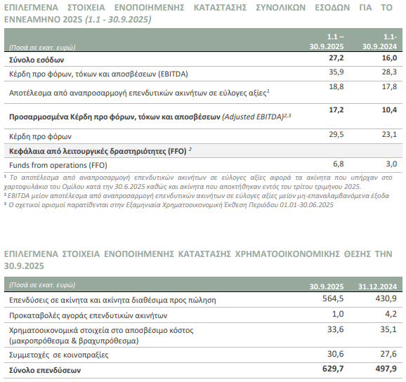 –70 ακίνητα και 531 χιλιάδες τ.μ. κτιρίων υπό διαχείριση από τον Όμιλο με τη συνολική αξία επενδύσεων να διαμορφώνεται σε € 629,7 εκ., αυξημένη κατά 26% σε σχέση με το τέλος του 2024. Ισχυροί δείκτες αποδοτικότητας με τη μικτή απόδοση των ακινήτων εισοδήματος (gross yield) να διαμορφώνεται σε 7,2% και τη μέση σταθμισμένη διάρκεια μισθώσεων ακινήτων (WAULT) να ανέρχεται σε 9,7 έτη κατά την 30.9.2025.