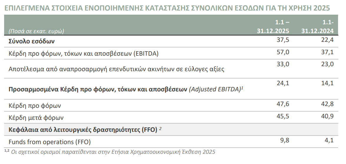 -Ακόμη, η Εταιρεία προχώρησε στην πρώτη της επένδυση εκτός Ελλάδας, αποκτώντας ξενοδοχειακή μονάδα στις Κανάριες νήσους. Η επέκταση στον ξενοδοχειακό κλάδο συνεχίστηκε με την απόκτηση δύο ξενοδοχειακών μονάδων στην Κω, η οποία ολοκληρώθηκε στις αρχές του 2026. Τέλος, πραγματοποιήθηκαν πωλήσεις 5 ακινήτων (οικόπεδα και οικιστικό ακίνητο στην Πάρο, εμπορικό ακίνητο στη Θεσσαλονίκη και οικόπεδο στην Κατερίνη) με το σχετικό κέρδος να ανέρχεται σε € 1,1 εκατ..