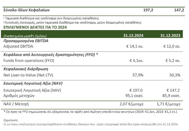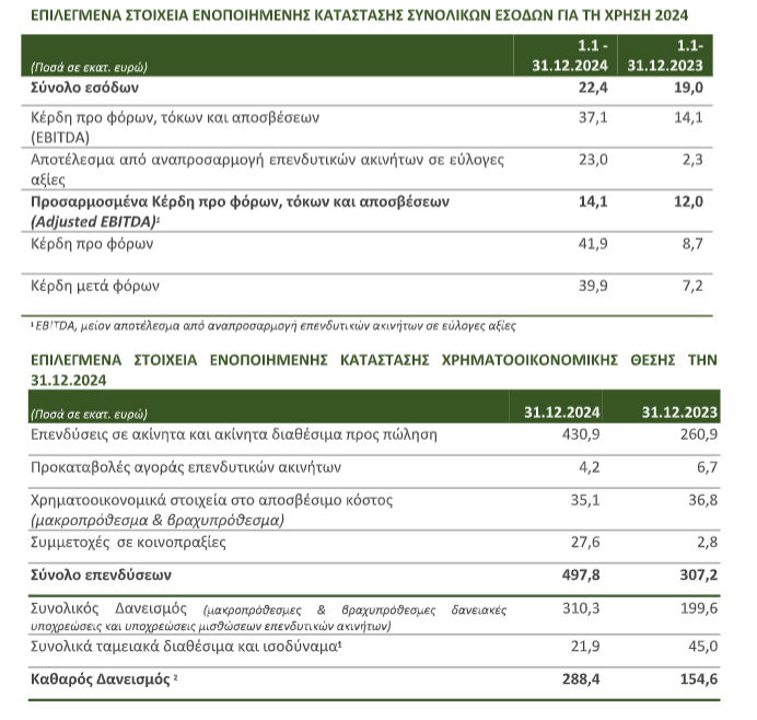 – Αύξηση εσόδων κατά 18% και αύξηση λειτουργικής κερδοφορίας (Adjusted EBITDA) κατά 18% σε ενοποιημένη βάση, σε σχέση με το 2023. Το κέρδος από τις πωλήσεις επενδυτικών ακινήτων ανήλθε σε € 1,5 εκατ. για το 2024 έναντι € 1,2 εκατ. για το 2023. Τα κέρδη μετά φόρων διαμορφώθηκαν σε σημαντικά υψηλότερα επίπεδα επηρεαζόμενα κυρίως από τις υψηλότερες αναπροσαρμογές επενδύσεων σε εύλογη αξία σε σχέση με την προηγούμενη χρήση αλλά και την αύξηση της αξίας των επενδύσεων σε κοινοπραξίες & συγγενείς εταιρείες ύψους € 11,7 εκατ..