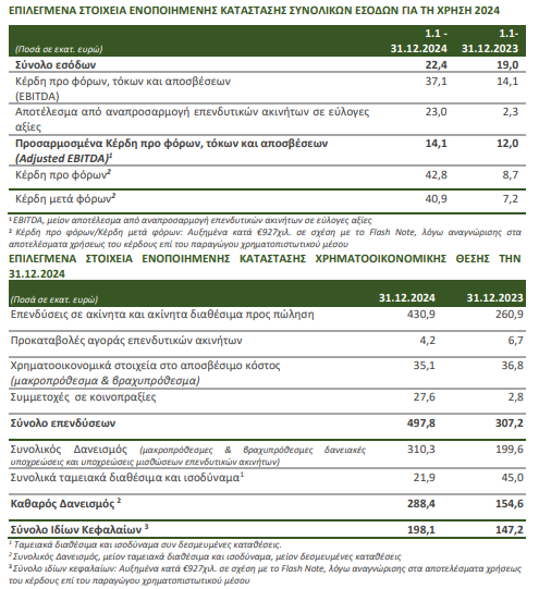 Αύξηση εσόδων κατά 18% και αύξηση λειτουργικής κερδοφορίας (Adjusted EBITDA) κατά 18%. σε ενοποιημένη βάση, σε σχέση με το 2023. Το κέρδος από τις πωλήσεις επενδυτικών ακινήτων ανήλθε σε € 1,5 εκατ. για το 2024 έναντι € 1,2 εκατ. για το 2023. Τα κέρδη μετά φόρων διαμορφώθηκαν σε σημαντικά υψηλότερα επίπεδα επηρεαζόμενα κυρίως από τις υψηλότερες αναπροσαρμογές επενδύσεων σε εύλογη αξία σε σχέση με την προηγούμενη χρήση αλλά και την αύξηση της αξίας των επενδύσεων σε κοινοπραξίες & συγγενείς εταιρείες ύψους € 11,7 εκατ..