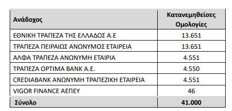Επίσης, από τις 50.000 Ομολογίες που κατανεμήθηκαν σε Ειδικούς Επενδυτές, οι Ανάδοχοι έλαβαν για δικό τους λογαριασμό 41.000 Ομολογίες ως ακολούθως: