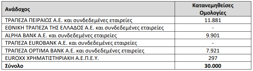 Επίσης, από τις 103.500 Ομολογίες που κατανεμήθηκαν σε Ειδικούς Επενδυτές, οι Ανάδοχοι έλαβαν για δικό τους λογαριασμό 30.000 Ομολογίες ως ακολούθως: