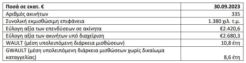 Την 30 Σεπτεμβρίου 2023, το χαρτοφυλάκιο του ομίλου αποτελείτο συνολικά από 376 (31 Δεκεμβρίου 2022: 381) ακίνητα (κυρίως καταστήματα και γραφεία) συνολικής εκμισθώσιμης επιφάνειας περίπου 1.447 χιλ. τ.μ. Τριακόσια είκοσι τρία (323) από αυτά τα ακίνητα βρίσκονται στην Ελλάδα, εκ των οποίων τα περισσότερα από αυτά βρίσκονται σε περιοχές υψηλής προβολής και εμπορικότητας. Επίσης, είκοσι τέσσερα (24) ακίνητα βρίσκονται στην Κύπρο, είκοσι πέντε (25) ακίνητα στην Ιταλία, δύο (2) ακίνητα στη Βουλγαρία και δύο (2) ακίνητα στη Ρουμανία.