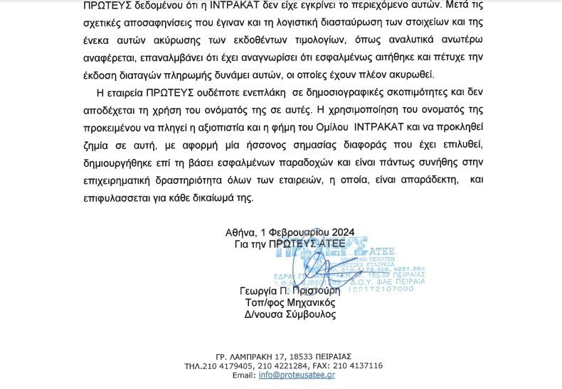 Σε ανακοίνωση που υπογράφει η διευθύνουσα σύμβουλος κ. Γεωργία Πριστούρη, αναφέρεται ότι τα τιμολόγια και οι σχετικές διαταγές πληρωμής που είχε εκδώσει η Πρωτεύς, είχαν εκδοθεί εσφαλμένα και έχουν ακυρωθεί. Αναφέρει μάλιστα ότι ορθώς η Intrakat δεν τις αποδέχτηκε.