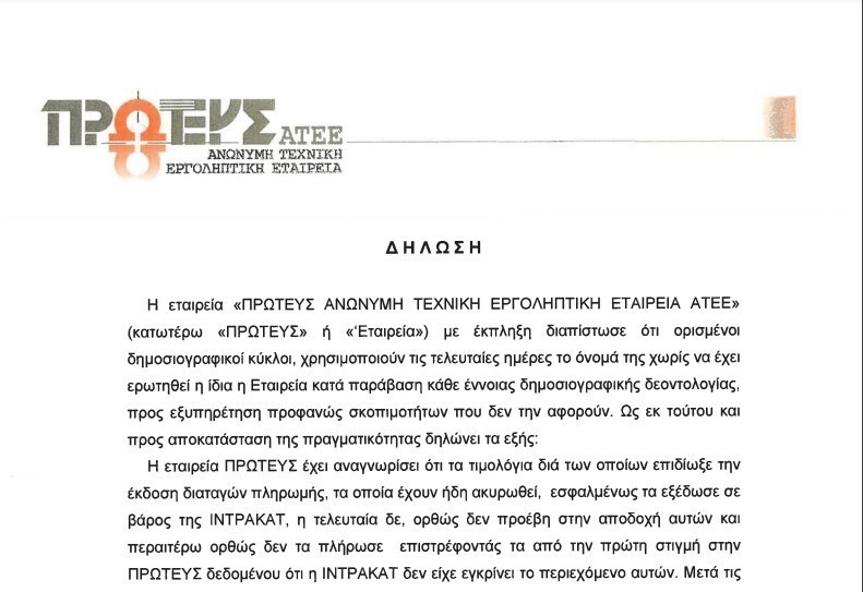 Απάντηση σε δημοσιεύματα του τύπου που φέρουν την τεχνική εταιρεία Πρωτεύς να έχει εκδώσει διαταγές πληρωμής σε βάρος της Ιntrakat, δίνει η διοίκηση της μικρής κατασκευαστικής εταιρείας.