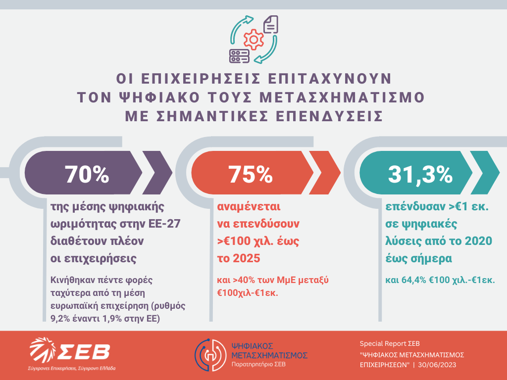 Το Παρατηρητήριο του ΣΕΒ για τον Ψηφιακό Μετασχηματισμό ολοκλήρωσε πρωτογενή έρευνα με σκοπό τη χαρτογράφηση των αναγκών, προτεραιοτήτων και προκλήσεων των επιχειρήσεων στην ψηφιακή τους μετάβαση. Πέρα από την πρωτογενή έρευνα, το Παρατηρητήριο αξιοποιεί ευρήματα του Δείκτη Ψηφιακής Ωριμότητας (Digital Maturity Index – DMΙ) του ΣΕΒ για να καταλήξει σε επισημάνσεις ως προς το πώς θα επιταχυνθεί ο ψηφιακός βηματισμός των επιχειρήσεων, ώστε να συγκλίνουμε ταχύτερα με τον ευρωπαϊκό μέσο όρο, προς όφελος της οικονομίας και κοινωνίας.