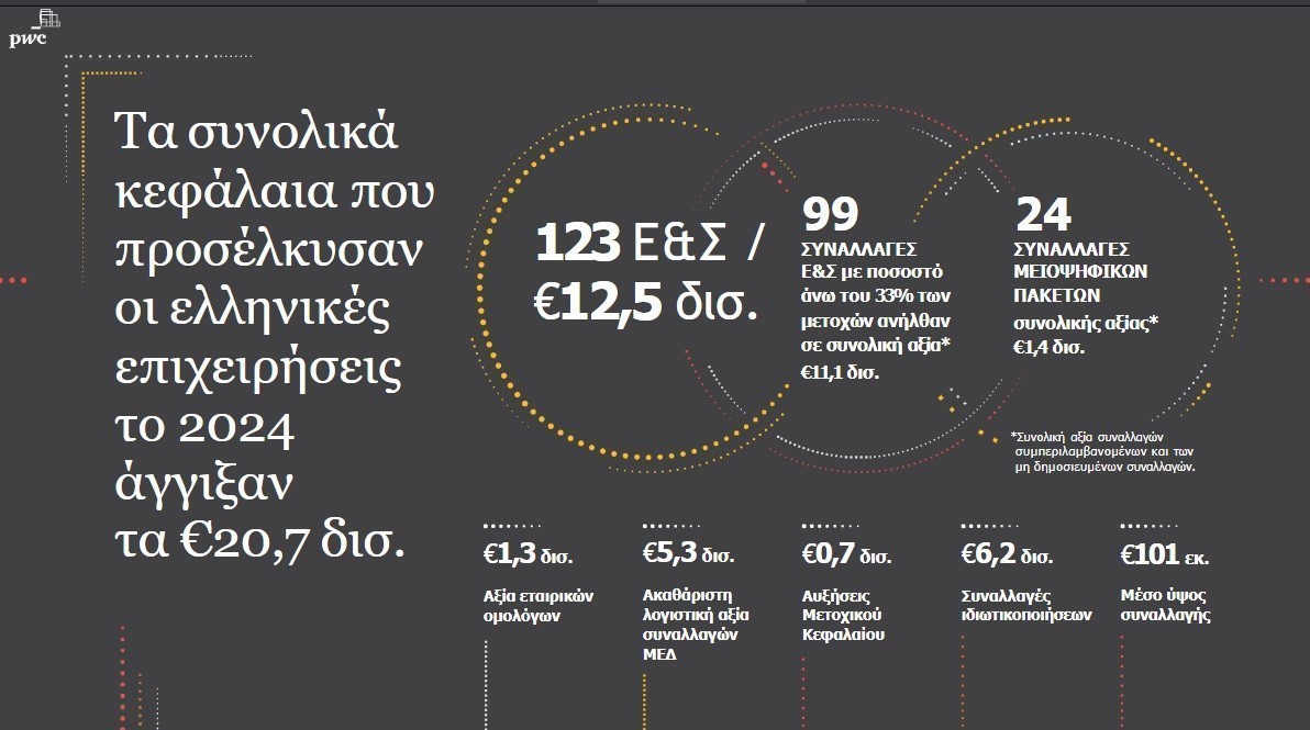 Οι κλάδοι πρωταγωνιστές για το 2025, σύμφωνα με τη PwC, στην Ελλάδα για εξαγορές και συγχωνεύσεις αναμένεται να είναι η τεχνολογία, η ενεργειακή μετάβαση (ΑΠΕ, μπαταρίες, αποθήκευση κ.α.), τα τρόφιμα και οι φαρμακευτικές.