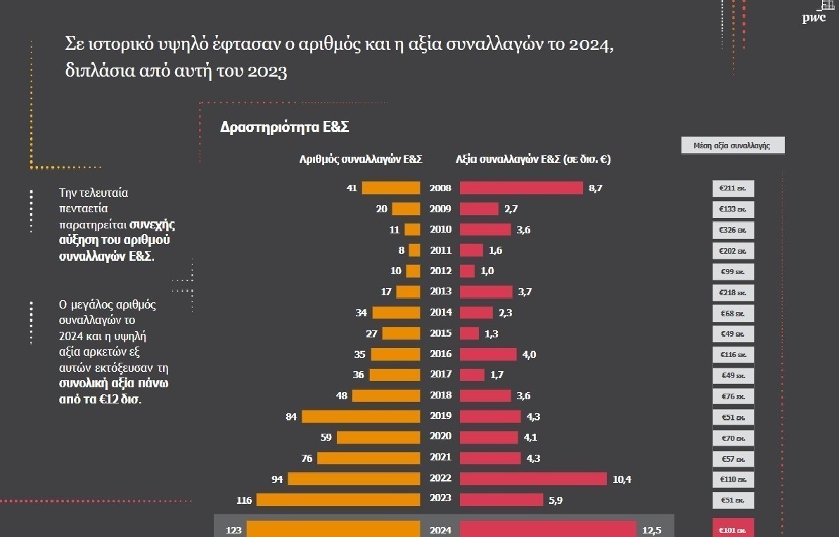 Αυτά αποτυπώθηκαν στην ετήσια μελέτη της PwC «Εξαγορές και Συγχωνεύσεις στην Ελλάδα το 2024» και, όπως ανέφεραν ο Θανάσης Πανόπουλος, Head of Deals, και ο Γιώργος Μακρυπίδης, Deals Partner, Head of Μ&Α, κατά την παρουσίασή της, η δυναμική του «ελατηρίου» δεν έχει εξαντληθεί στην Ελλάδα. Όπερ μεθερμηνευόμενον, η ροή κεφαλαίων προς την Ελλάδα θα συνεχιστεί, τα πολλαπλασιαστικά οφέλη των επενδύσεων που έχουν μέχρι σήμερα υλοποιηθεί θα γίνονται εμφανέστερα και τα M&A’s θα αυξάνονται όσο η ελληνική οικονομία συνεχίζει να ανακτά τη δυναμική της και να κινείται σε ένα περιβάλλον (πολιτικής και μη) σταθερότητας. Παράλληλα αποτυπώνεται η χάραξη και υλοποίηση νέων επενδυτικών πλάνων στις εξαγορασθείσες εταιρείες από τους καινούργιους ιδιοκτήτες, την αναβάθμιση εξοπλισμών και γραμμών παραγωγής, τη βελτίωση διαδικασιών και γενικά τη διάθεση για δημιουργία υπεραξίας μέσω σημαντικών επενδύσεων.