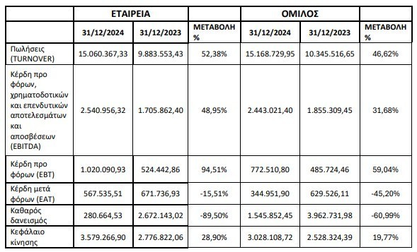Τα κύρια οικονομικά μεγέθη στην εταιρεία και στον όμιλο για το 2024, σε σύγκριση με το 2023, έχουν ως ακολούθως:
