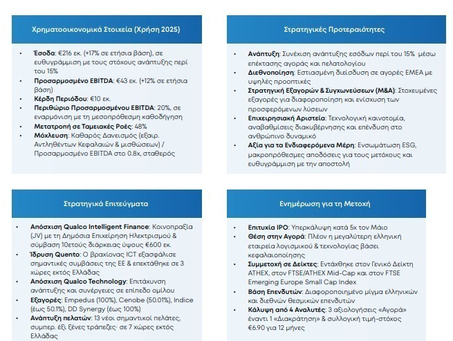 ◦ Έσοδα IPO που χρησιμοποιήθηκαν για M&A περιλαμβάνουν τις επενδύσεις στις Empedus, Cenobe, Middle Office, DD Synergy και την ίδρυση της Quento, βραχίονα ICT του ομίλου Qualco.