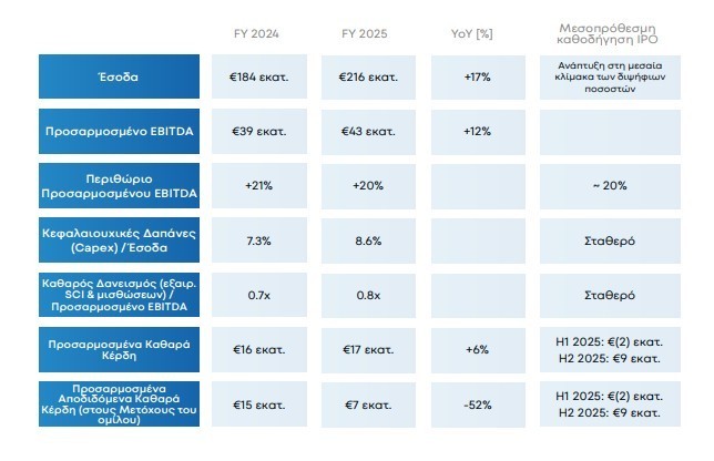 Ειδικότερα, κατά τη χρήση 2025 (FY 2025), ο όμιλος σημείωσε αύξηση εσόδων κατά 17% και αύξηση Προσαρμοσμένου EBITDA κατά 12% σε ετήσια βάση. Για τους δώδεκα μήνες που έληξαν στις 31 Δεκεμβρίου 2025, κατέγραψε περιθώριο Προσαρμοσμένου EBITDA 20%, σε ευθυγράμμιση με την καθοδήγηση της δημόσιας εγγραφής. Η μόχλευση παρέμεινε σταθερή στο 0.8x Καθαρός Δανεισμός (εξαιρουμένων των αντληθέντων κεφαλαίων από τη Δημόσια Προσφορά και των μισθώσεων) προς Προσαρμοσμένο EBITDA, ενώ η μετατροπή σε ταμειακές ροές ανήλθε σε 48%.