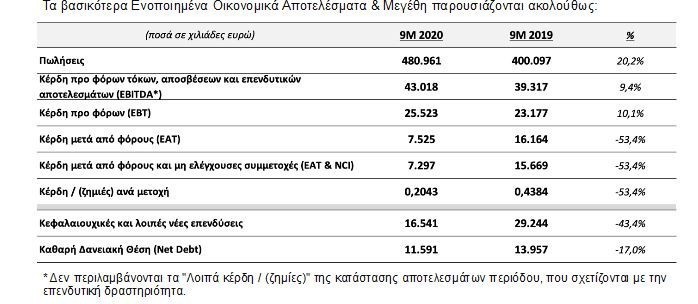 Στο εννεάμηνο του 2020 υπήρξε βελτίωση στις πωλήσεις (+11%), η οποία συνοδεύτηκε από αύξηση της προ φόρων κερδοφορίας (+4,5%). Η εταιρεία κατά το Β’ τρίμηνο είχε έκτακτες δαπάνες (άνω του €1 εκ.) για την αντιμετώπιση των έκτακτων συνθηκών που προέκυψαν από την πανδημία Covid-19 κατά τη διάρκεια του Β’ τριμήνου με ισόποση επίδραση στα αποτελέσματά της.