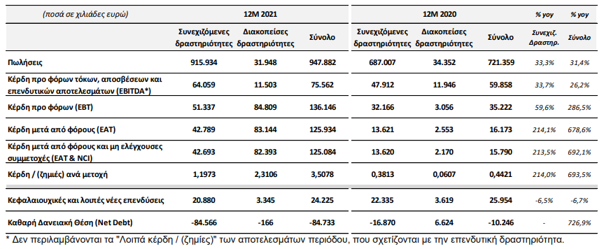 Η καθαρή δανειακή θέση (δάνεια μείον ταμειακά διαθέσιμα) του Ομίλου διαμορφώθηκε σε -€84,6 εκ. έναντι – €10,2 εκ. στις 31/12/2020, δεδομένου ότι τα έσοδα από την πώληση της Cardlink ενίσχυσαν σημαντικά τη ρευστότητα του Ομίλου. Οι επενδύσεις του Ομίλου ανήλθαν σε €24,2 εκ. με την πλειονότητά τους να κατευθύνεται στην ανάπτυξη των υποδομών του κλάδου ταχυδρομικών υπηρεσιών. Στις συνεχιζόμενες δραστηριότητες περιλαμβάνονται έκτακτα κεφαλαιακά κέρδη (ΕΒΤ και ΕΑΤ) ύψους €2 εκ., κυρίως από την πώληση της μειοψηφικής συμμετοχής στην εταιρεία Teka Systems AE. Σημειώνεται ότι τα κέρδη μετά φόρων από συνεχιζόμενες δραστηριότητες του 12Μ2020 ήταν επιβαρυμένα από έκτακτη φορολογική επιβάρυνση ύψους €11,1 εκ.. Εξαιρώντας την εν λόγω έκτακτη επιβάρυνση, τα κέρδη μετά φόρων από συνεχιζόμενες δραστηριότητες στο 12Μ2021 ήταν βελτιωμένα κατά 73% από πέρυσι.
