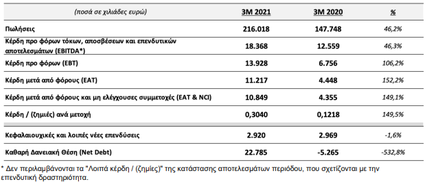 Κατά το πρώτο τρίμηνο του 2021 σημειώθηκε διψήφια αύξηση στις πωλήσεις (+24,3%), υπερδιπλασιασμός στην προ φόρων κερδοφορία (+137,7%) και βελτίωση των περιθωρίων κέρδους.
