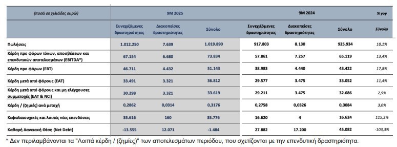 Σε σύγκριση με το αντίστοιχο εννεάμηνο του 2024, οι πωλήσεις σημείωσαν αύξηση 10,1%, η λειτουργική κερδοφορία (EBITDA) 13,4%, τα κέρδη προ φόρων (ΕΒΤ) 17,8%, τα καθαρά κέρδη μετά από φόρους (ΕAΤ) 11,4%.