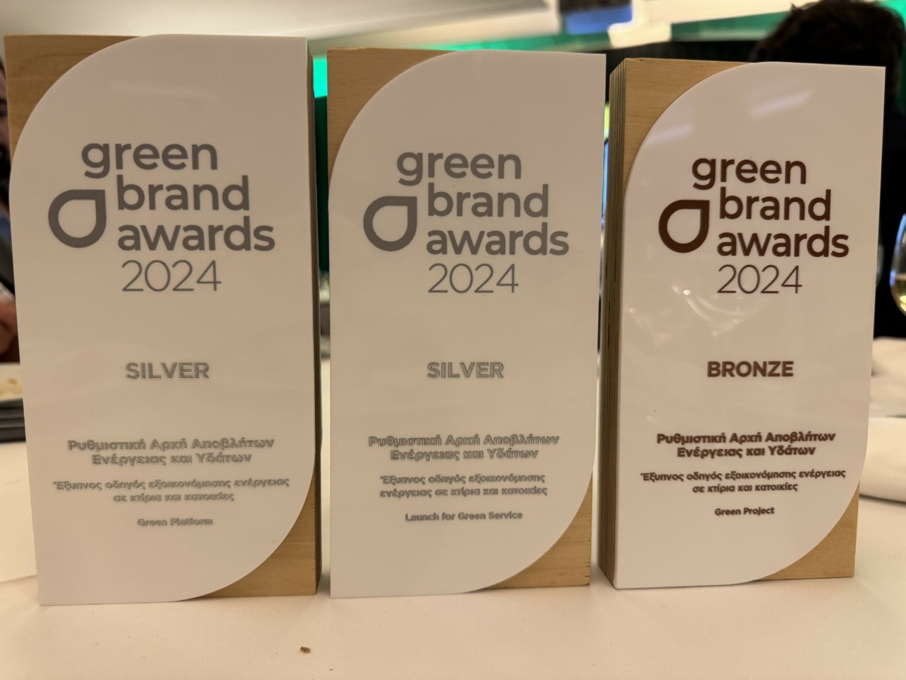 Δύο ασημένια και ένα χάλκινο βραβείο για τον «Έξυπνο οδηγό εξοικονόμησης ενέργειας σε κτίρια και κατοικίες» απέσπασε η Ρυθμιστική Αρχή Αποβλήτων, Ενέργειας και Υδάτων στα βραβεία Green Brand Awards 2024 που απονεμήθηκαν την Πέμπτη 21 Μαρτίου 2024 σε ξενοδοχείο της Αττικής.