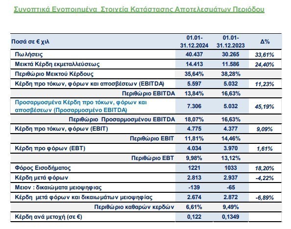 Αύξηση 11% στο EBITDA και 45% στο Προσαρμοσμένο EBITDA Τα Κέρδη προ τόκων, φόρων και αποσβέσεων (EBITDA) του Ομίλου διαμορφώθηκαν στα €5.597 χιλ. έναντι €5.032 τη χρήση του 2023 παρουσιάζοντας αύξηση 11,23%.