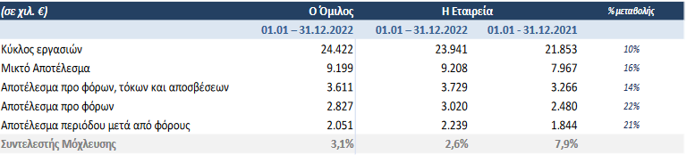Στην χρήση του 2022 ο κύκλος εργασιών της σε επίπεδο ομίλου διαμορφώθηκε στα 24,42 εκατ. ευρώ καταγράφοντας αύξηση άνω του 10%, με διψήφια επίσης κερδοφορία. Για το 2023, η διοίκηση προσδοκά σημαντική αύξηση του κύκλου εργασιών της εταιρείας, στο εύρος του 30% και αύξηση της οργανικής κερδοφορίας (EBITDA) περίπου κατά 40% σε σχέση με το 2022.