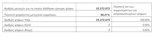 Συμμετείχε 1 μέτοχος που εκπροσωπεί 55.372.675 κοινές ονομαστικές μετοχές (55.372.675 δικαιώματα ψήφου) επί συνόλου 57.434.884 κοινών ονομαστικών μετοχών (και 57.434.884 δικαιωμάτων ψήφου), ήτοι ποσοστό 96,41% του καταβεβλημένου μετοχικού κεφαλαίου.