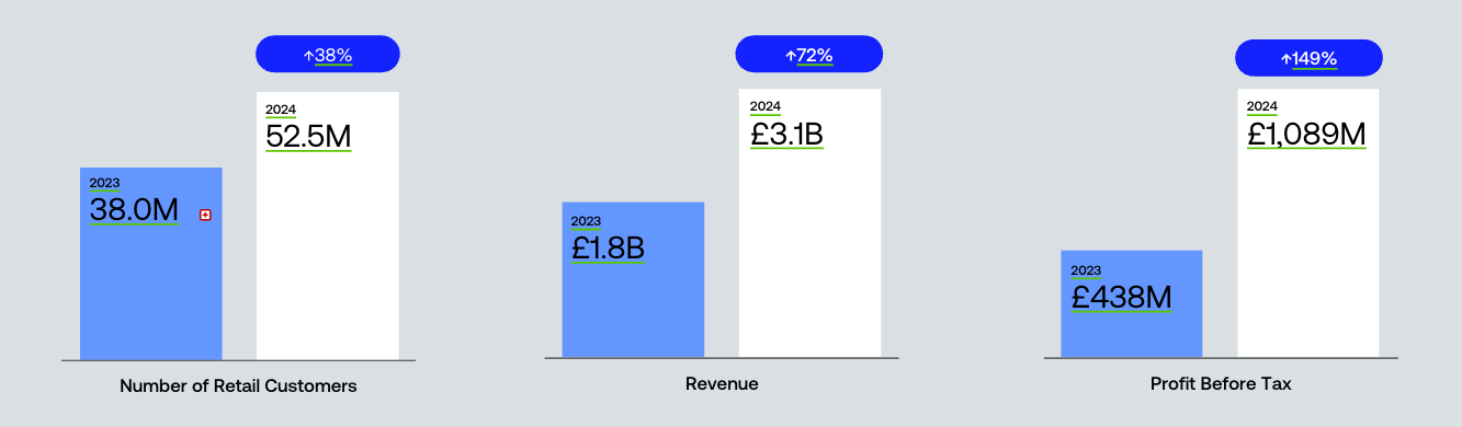 Αύξηση εσόδων: Τα έσοδα του Ομίλου αυξήθηκαν κατά 72% σε 4 δισ. δολάρια ΗΠΑ (3,1 δισ. λίρες Αγγλίας), από 2,2 δισ. δολάρια ΗΠΑ (1,8 δισ. λίρες Αγγλίας) το 2023, λόγω της διεύρυνσης της πελατειακής βάσης και της αυξημένης χρήσης των προϊόντων.