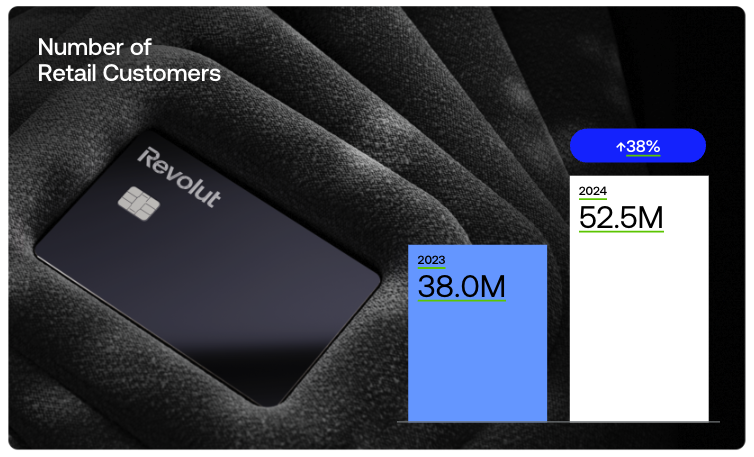 Ρεκόρ απόκτηση νέων πελατών: Η Revolut καλωσόρισε σχεδόν 15 εκατ. νέους πελάτες παγκοσμίως, φτάνοντας τους 52,5 εκατ. πελάτες συνολικά μέχρι το τέλος του έτους (38% αύξηση).