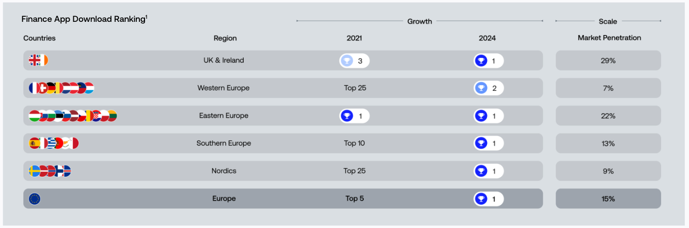Ηγετική θέση στην αγορά και εμβέλεια: Η δυναμική της ανάπτυξης ήταν ισχυρή σε όλη την Ευρώπη. Η Revolut είναι πλέον η εφαρμογή με τα περισσότερα downloads στην κατηγορία «Χρηματοοικονομικά», καταλαμβάνοντας την πρώτη θέση σε 19 χώρες και εξασφαλίζοντας μια θέση στην πρώτη τριάδα σε 26 χώρες της Γηραιάς ηπείρου.