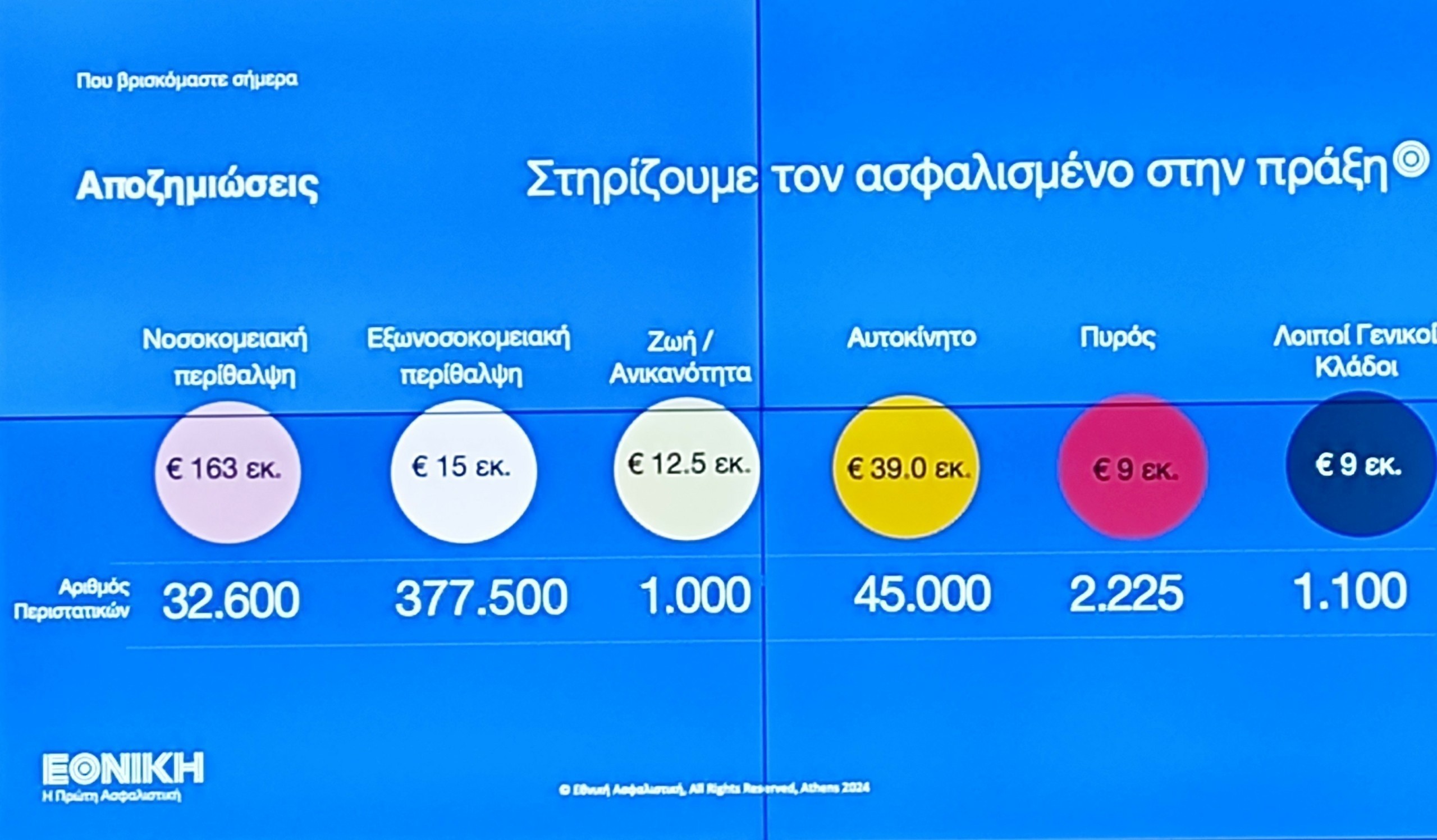 Πάντως ο ίδιος έσπευσε να τονίσει πως για την ασφαλιστική αγορά υγιές είναι ο δείκτης ασφάλισης και αποζημιώσεων να μην είναι χαμηλός, προκειμένου οι εταιρείες να επιτελούν το ρόλο που έχουν αναλάβει και την ίδια ώρα οι πελάτες να μην θεωρούν τις υπηρεσίες τους κάτι περιττό. Σύμφωνα με τα στοιχεία που παρουσίασε η Εθνική Ασφαλιστική πέρυσι κατέβαλε 163 εκατ. ευρώ αποζημιώσεις μόνο για νοσοκομειακή περίθαλψη.