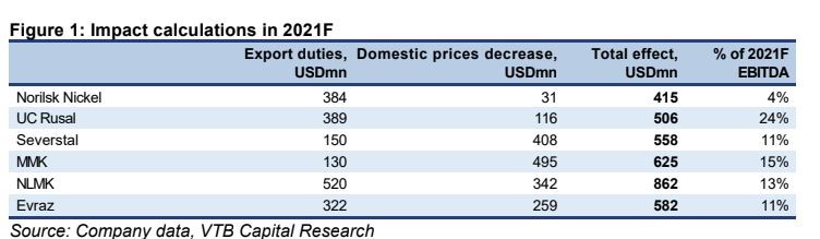 Όπως αναφέρει η VTB Capital στην έκθεσή της, παραμένει η αβεβαιότητα για το εάν οι επιβληθέντες νέοι δασμοί θα επεκταθούν πέραν του 2021. Οι δασμοί θα εισαχθούν από την 1η Αυγούστου έως τις 31 Δεκεμβρίου 2021, ωστόσο τα οικονομικά υπουργεία σκοπεύουν να ενημερώσουν τη νομοθεσία έτσι ώστε το κράτος να ωφεληθεί όσο το δυνατόν περισσότερο από τις περιόδους των υψηλών τιμών για τα μέταλλα.