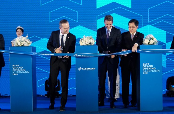 Τα εγκαίνια της νέας μονάδας παραγωγής των ανελκυστήρων της ελληνικής εταιρείας Kleeman στη Σαγκάη έκανε πριν από λίγο ο πρωθυπουργός Κυριάκος Μητσοτάκης μαζί με το δήμαρχο της Σαγκάης και τους αδερφούς Κουκούντζου, ιδιοκτήτες της εταιρείας.