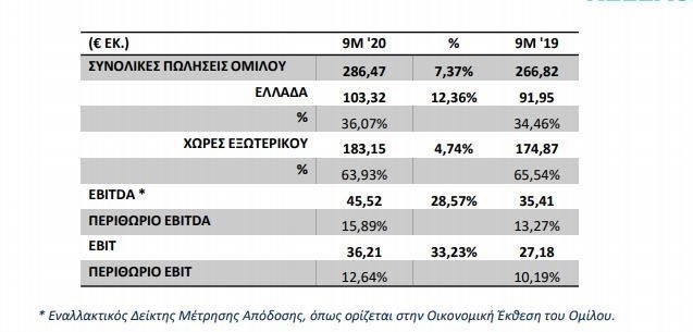 Οι πωλήσεις του Ομίλου κατά την διάρκεια του εννεαμήνου του 2020 ανήλθαν σε € 286,47 εκ. από € 266,82 εκ. το εννεάμηνο του 2019, αυξημένες κατά 7,37%. Η Ελλάδα παρουσίασε πωλήσεις ύψους €103,32 εκ. κατά το εννεάμηνο του 2020 συγκριτικά με €91,95 εκ. το εννεάμηνο του 2019, αυξημένες κατά 12,36%. Οι Ξένες Χώρες, σημείωσαν άνοδο πωλήσεων κατά 4,74% και διαμορφώθηκαν σε €183,15 εκ. το εννεάμηνο του 2020 από €174,87 εκ. το εννεάμηνο του 2019.