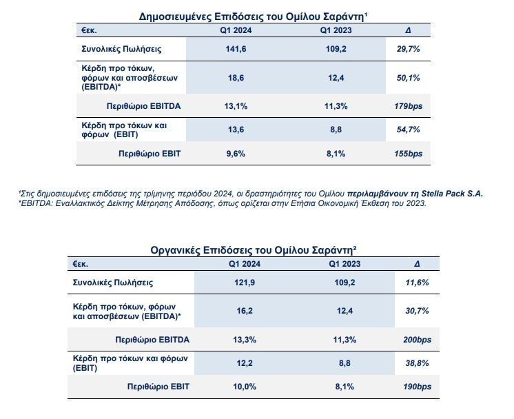 Η ΓΡ. ΣΑΡΑΝΤΗΣ Α.Β.Ε.Ε. (SAR.AT, SAR:GA) ανακοινώνει τη σύνοψη των οικονομικών αποτελεσμάτων α’ τριμήνου 2024 σημειώνοντας ότι τα αποτέλεσματα αποτελούν ένα αισιόδοξο ξεκίνημα για το έτος Με ισχυρή οργανική ανάπτυξη, είμαστε σε τροχιά επίτευξης των στόχων μας