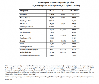 Ο παραπάνω πίνακας P&L παρουσιάζει τα ενοποιημένα οικονομικά μεγέθη του Ομίλου εξαιρουμένης της συνεισφοράς της εταιρείας ELCA Cosmetics Ltd, η οποία προηγουμένως ενοποιούνταν ως θυγατρική με τη μέθοδο της καθαρής θέσης. Υπενθυμίζεται ότι την 15 Ιουνίου 2022 και μετά από 21 χρόνια επιτυχούς συνεργασίας, ο Όμιλος προέβη στην πώληση του κατά 49% ποσοστού συμμετοχής της στο Joint Venture με την εταιρεία The Estée Lauder Companies, ELCA Cosmetics Ltd.