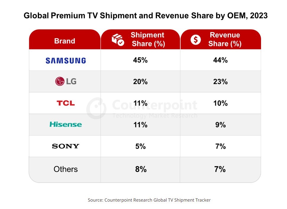 Οι αναλυτές επισημαίνουν ότι οι πωλήσεις premium τηλεοράσεων το 2023 μειώθηκαν μεν κατά 1% σε ετήσια βάση, ωστόσο, αύξησαν το μερίδιο αγοράς τους στο 10%, υποβοηθούμενο από την άνοδο στην Κίνα, η οποία είδε τις αποστολές και τα έσοδά της να αυξάνονται κατά 39% και 49% αντίστοιχα.