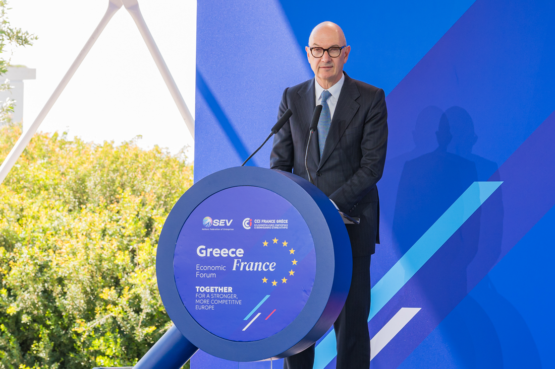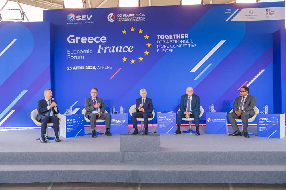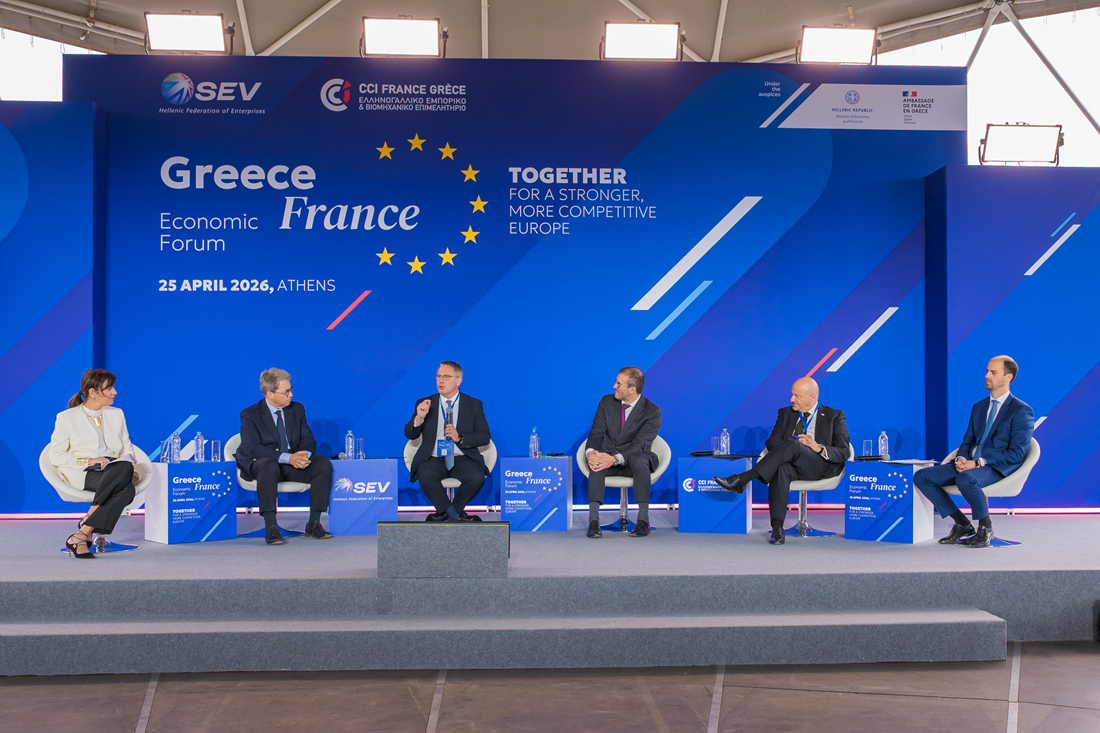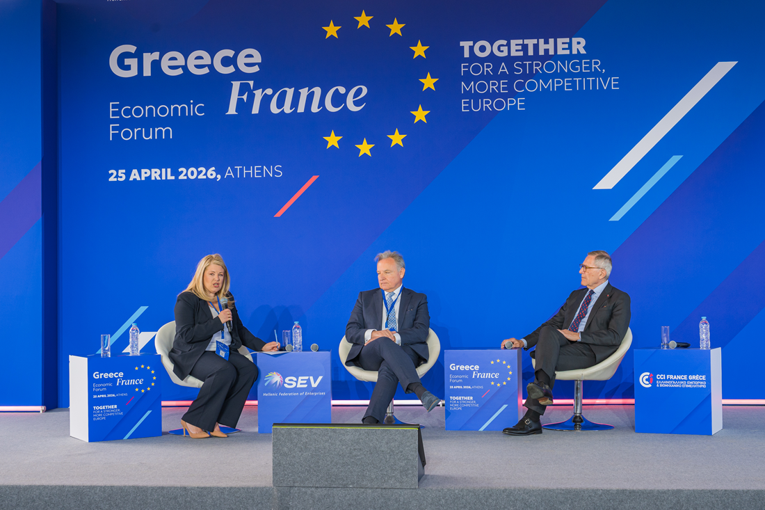 Με ισχυρή συμμετοχή εκπροσώπων της πολιτικής και επιχειρηματικής κοινότητας από την Ελλάδα και τη Γαλλία πραγματοποιήθηκε, το Σάββατο 25.04.2026, το Greece–France Economic Forum, που συνδιοργανώθηκε από τον ΣΕΒ και το Ελληνογαλλικό Εμπορικό και Βιομηχανικό Επιμελητήριο (CCIFG), στο πλαίσιο της επίσημης επίσκεψης στην Αθήνα του Προέδρου της Γαλλικής Δημοκρατίας, Emmanuel Macron. Το Φόρουμ επιβεβαίωσε ότι η Ευρώπη καλείται να κινηθεί με μεγαλύτερη ταχύτητα, συντονισμό και στρατηγική στόχευση ώστε να αξιοποιήσει τη διαθεσιμότητα πόρων και τεχνογνωσίας. Σε αυτό το πλαίσιο, η συνεργασία Ελλάδας και Γαλλίας αναδεικνύεται σε ουσιαστικό παράδειγμα για την ενίσχυση της ευρωπαϊκής ανταγωνιστικότητας και στρατηγικής αυτονομίας σε κρίσιμους τομείς, όπως η άμυνα, η τεχνολογία και η ενέργεια.
