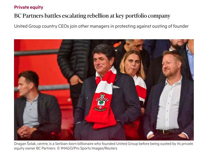 Σε ανοιχτή σύγκρουση με τους ιδιοκτήτες του ιδιωτικού επενδυτικού ταμείου BC Partners βρίσκονται πλέον κορυφαία στελέχη της United Group, μετά την αιφνίδια απομάκρυνση του ιδρυτή και προέδρου Ντράγκαν Σόλακ και της διευθύνουσας συμβούλου Βικτόρια Μπόκλαγκ τον Ιούνιο.