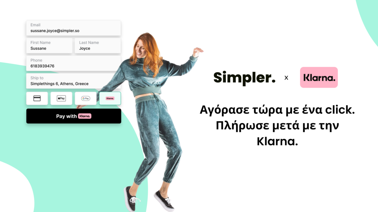 Με την ενσωμάτωση της υπηρεσίας της Klarna, οι έμποροι της Simpler μπορούν να προσφέρουν μια επιπλέον μέθοδο ολοκλήρωσης αγορών στους πελάτες τους. Οι πελάτες θα έχουν τώρα τη δυνατότητα να πληρώσουν τις αγορές τους με το σχέδιο δόσεων “Pay in 3” της Klarna, επιτρέποντας τους να κατανείμουν τις πληρωμές τους σε τρεις ίσες δόσεις χωρίς τόκους και κρυφές χρεώσεις.